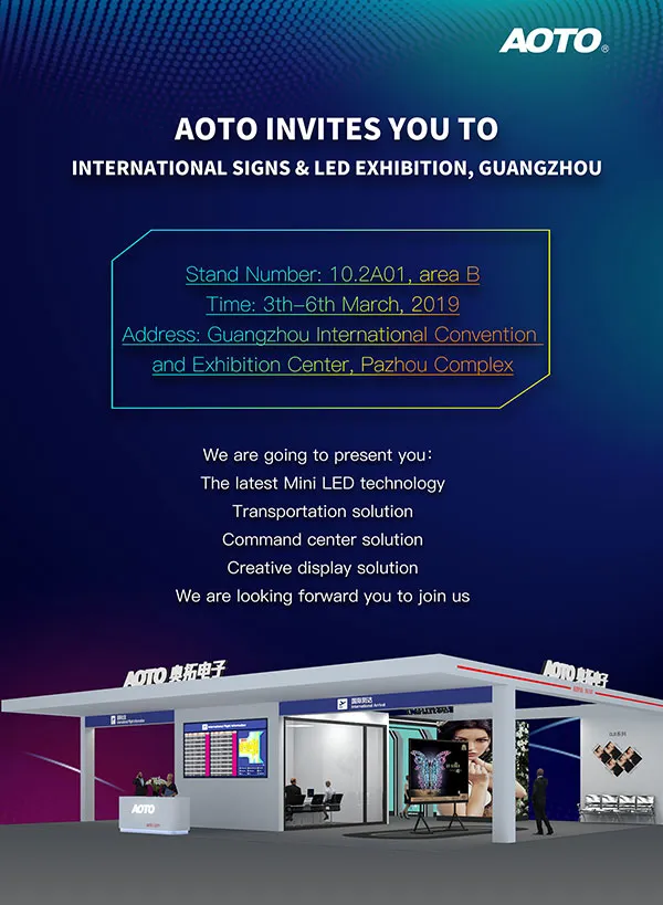 From 3rd Mar. to 6th Mar. 2019, International Signs & LED Exhibition, Guangzhou (“ISLE”) will be held in Canton Fair Exhibition Hall. ISLE is a domestic high-quality advertising logo and LED industry platform. AOTO will take our latest Mini LED products, technologies and solutions to the exhibition, and our exhibition area will be over 229m㎡. Welcome to visit our booth!