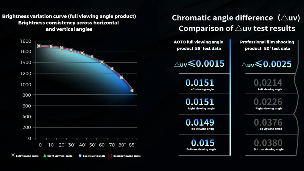 AOTO’s unique full-view technology provides consistent visual effects at any shooting angle. It realizes a 360° full-view display with no blind spots and ensures consistent brightness and color when shooting from various angles. This completely eliminates color bias that occurs when shooting at wide viewing angles.